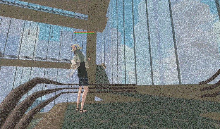 The player throws a heavy water cooler a short distance followed by a light weapon which travels much further.