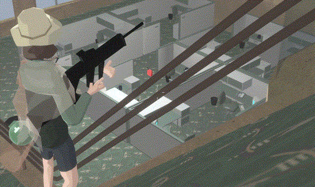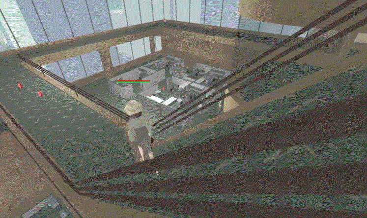 The player shoots a gasoline canister and the resulting gasoline puddle to create a fire that spreads to all adjacent cubicles. The player then throws a grenade which causes the fire to spread to the remaining cubicles.